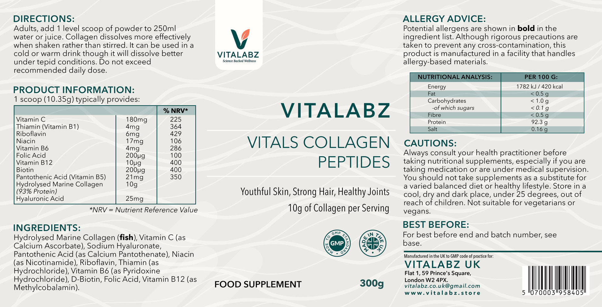 Each serving delivers 10g of hydrolysed marine collagen peptides (Type I), enhanced with hyaluronic acid, vitamin C, and a full spectrum of B-complex vitamins for optimal absorption, hydration, and collagen production.